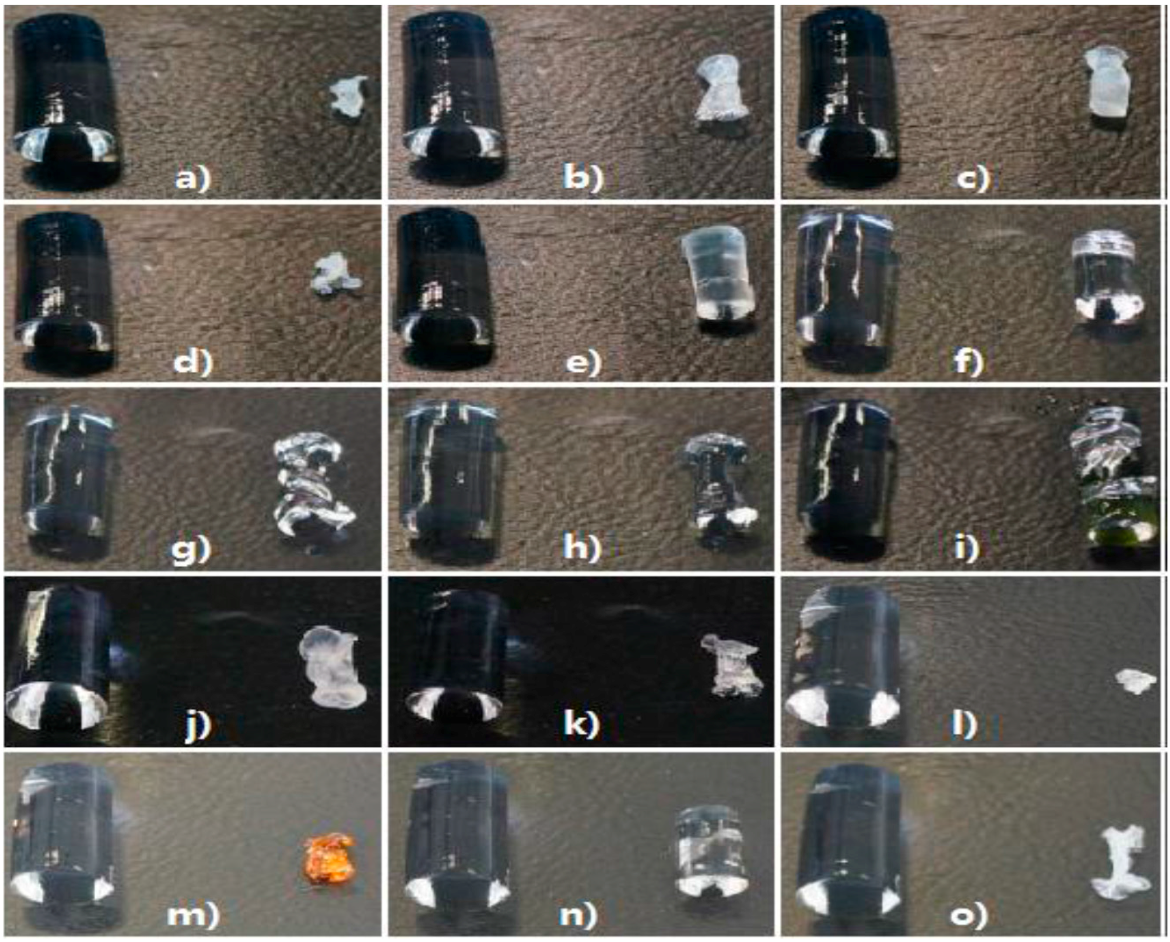 Pictures of shrunk gels compared to an original hydrogel. The hydrogels are placed on the left in each picture, and on the right are the gels once soaked in (a) methyl ethyl ketone (MEK); (b) isopropanol (IPA); (c) acetone; (d) 1-butanol; (e) methanol (MeOH); (f) dimethyl sulfoxide (DMSO); (g) glycerol; (h) propylene glycol; (i) ethylene glycol; (j) ethanol; (k) 1,4-dioxane; (l) propylene carbonate; (m) furfuryl alcohol; (n) N,N-dimethylformamide (DMF) and (o) acetonitrile.