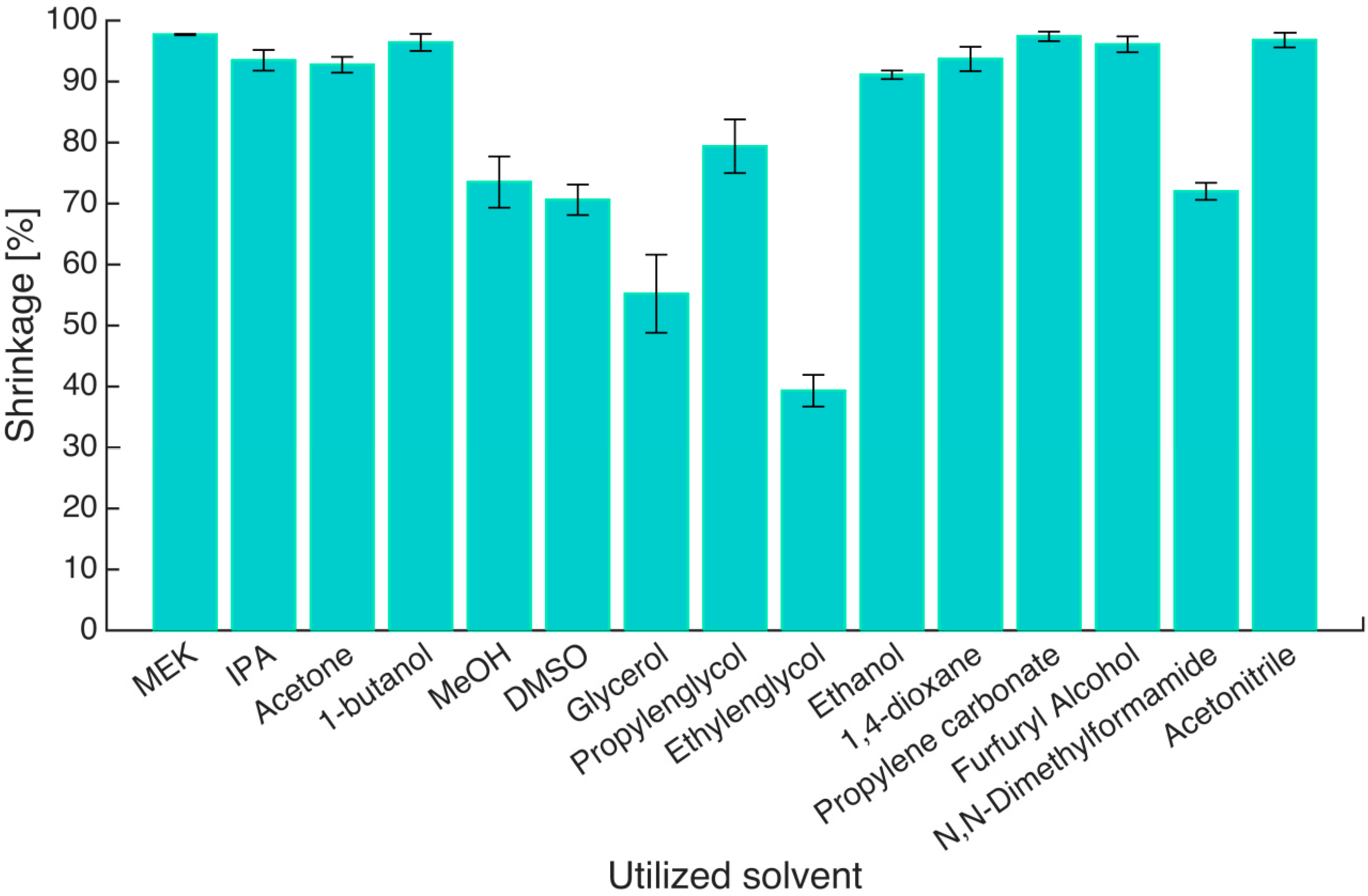 In order to observe the impact of solvent on the shrinkage, one piece (approx. 1.5 g) of calcium alginate hydrogel (0.5 wt %, Q1) was added into a falcon tube with 30 g of a specific solvent. The falcon tube was then sealed and kept onto a sample rotator to keep solvent homogenous at room temperature for 48 h. The volume of the gels was measured before and after solvent exchange for shrinkage calculations. The shrinkage was expressed as the volumetric yield (see below). Three parallel experiments were carried out for each solvent. Fifteen different solvents were tested, which include methanol, ethanol, isopropanol (IPA), 1-butanol, furfuryl alcohol, acetone, methyl ethyl ketone (MEK), acetonitrile, dimethyl sulfoxide (DMSO), propylene carbonate, glycerol, propylene glycol, ethylene glycol, 1,4-dioxane, and N,N-dimethylformamide (DMF).