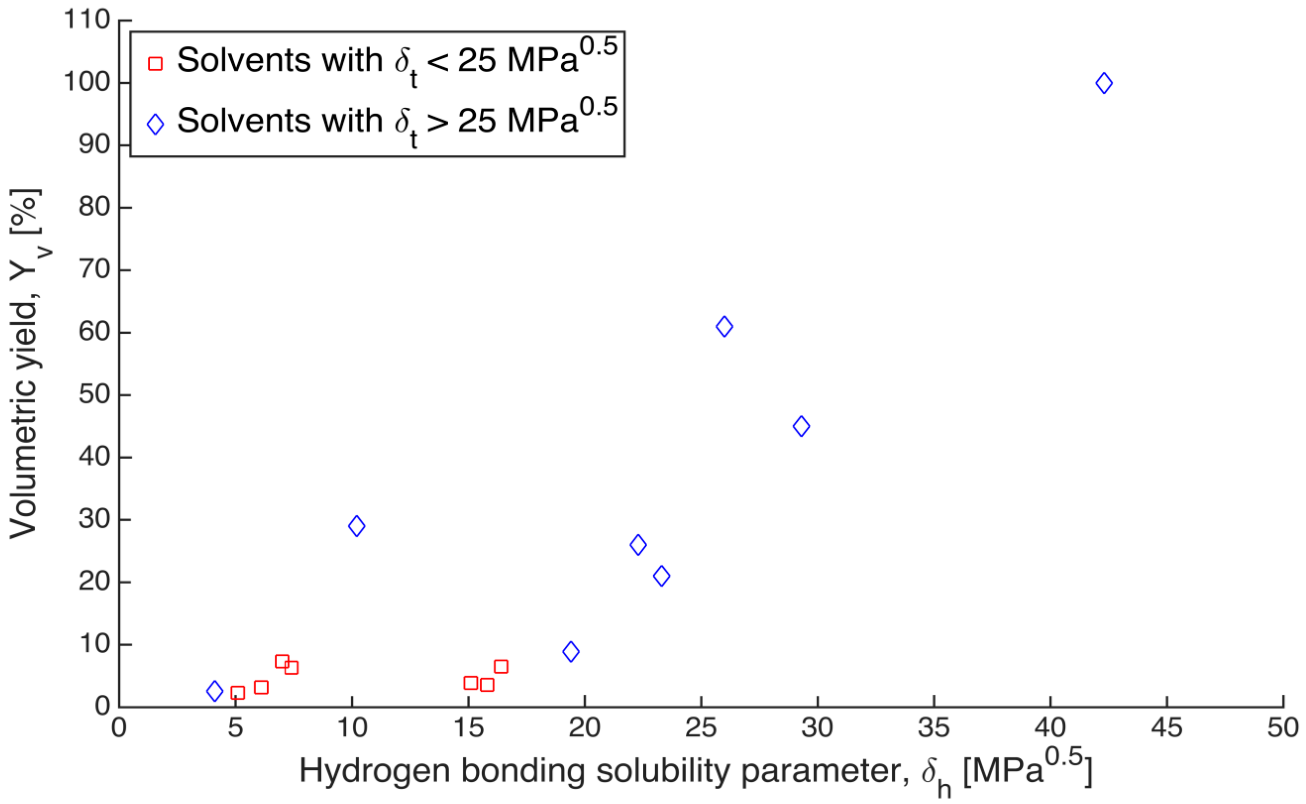 | Solvents | δd MPa0.5 | δp MPa0.5 | δh MPa0.5 | δt MPa0.5 | Volumetric Yield |