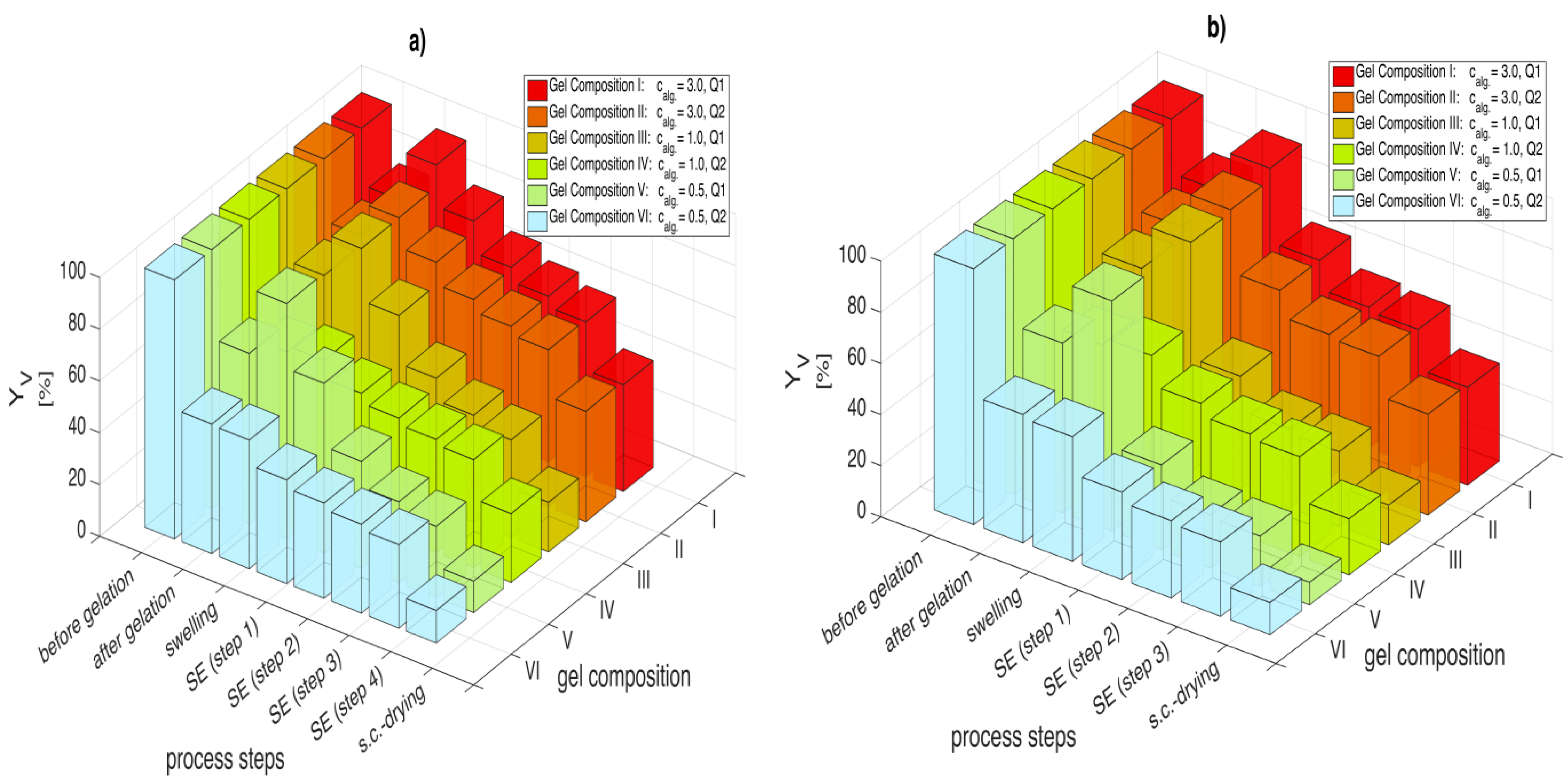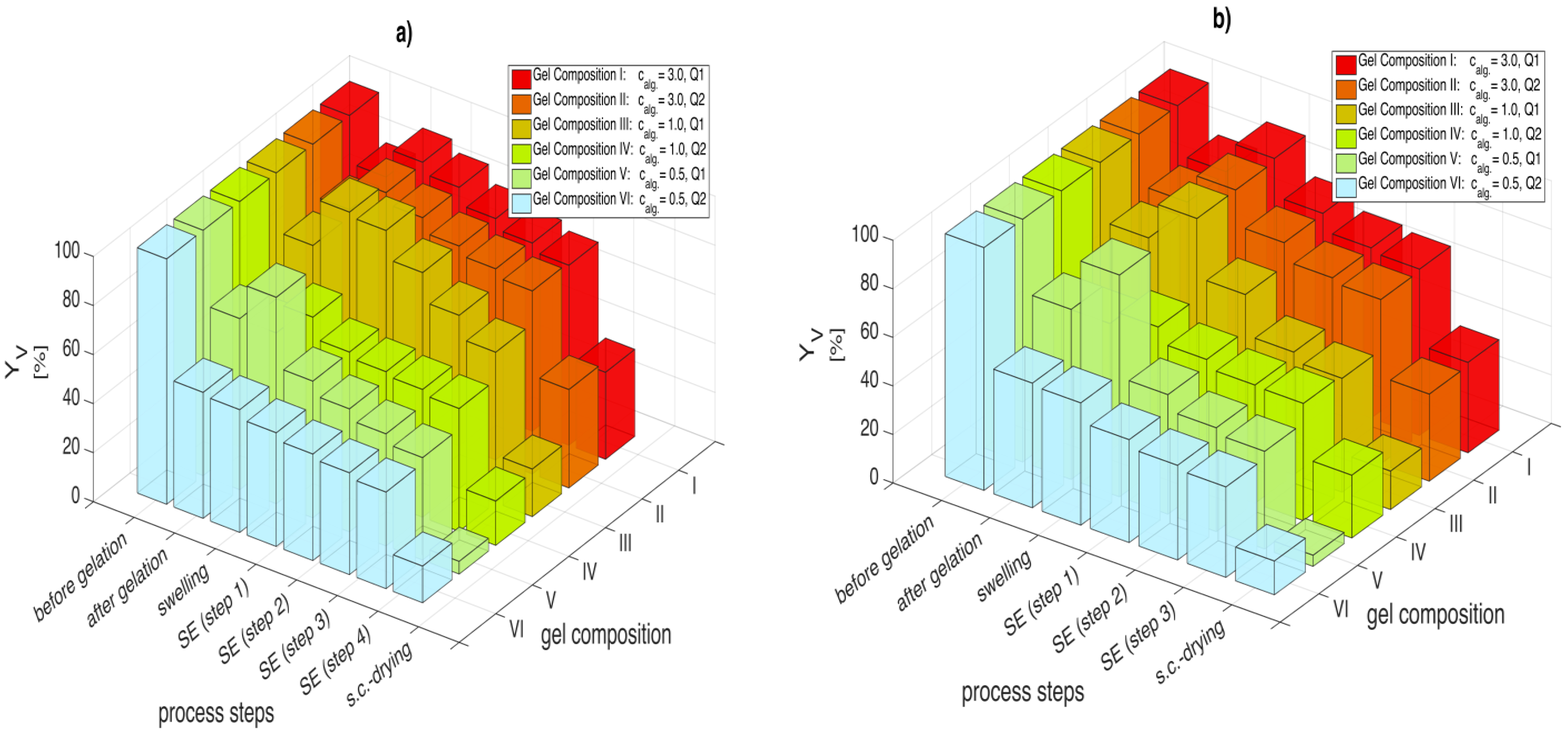 Analyzing gel volumes during solvent exchange with a solvent concentration gradient of 30 wt % (Figure 5a) shows that high alginate concentration gels exhibit higher volumetric yields (gel composition II: Yv,4 = 60.6%, gel composition V: Yv,4 = 27.6%) after solvent exchange (steps 1 to 4). Lower crosslinking degree results in very high shrinkage during solvent exchange (gel composition V: ΔYv (swelling → step 4) = 63.1%, gel composition VI: ΔYv (swelling → step 4) = 17.5%). It is also observed that the shrinkage is most severe during the early steps of the solvent exchange (70%–80% of the total shrinkage occurs in the first two solvent exchange steps).