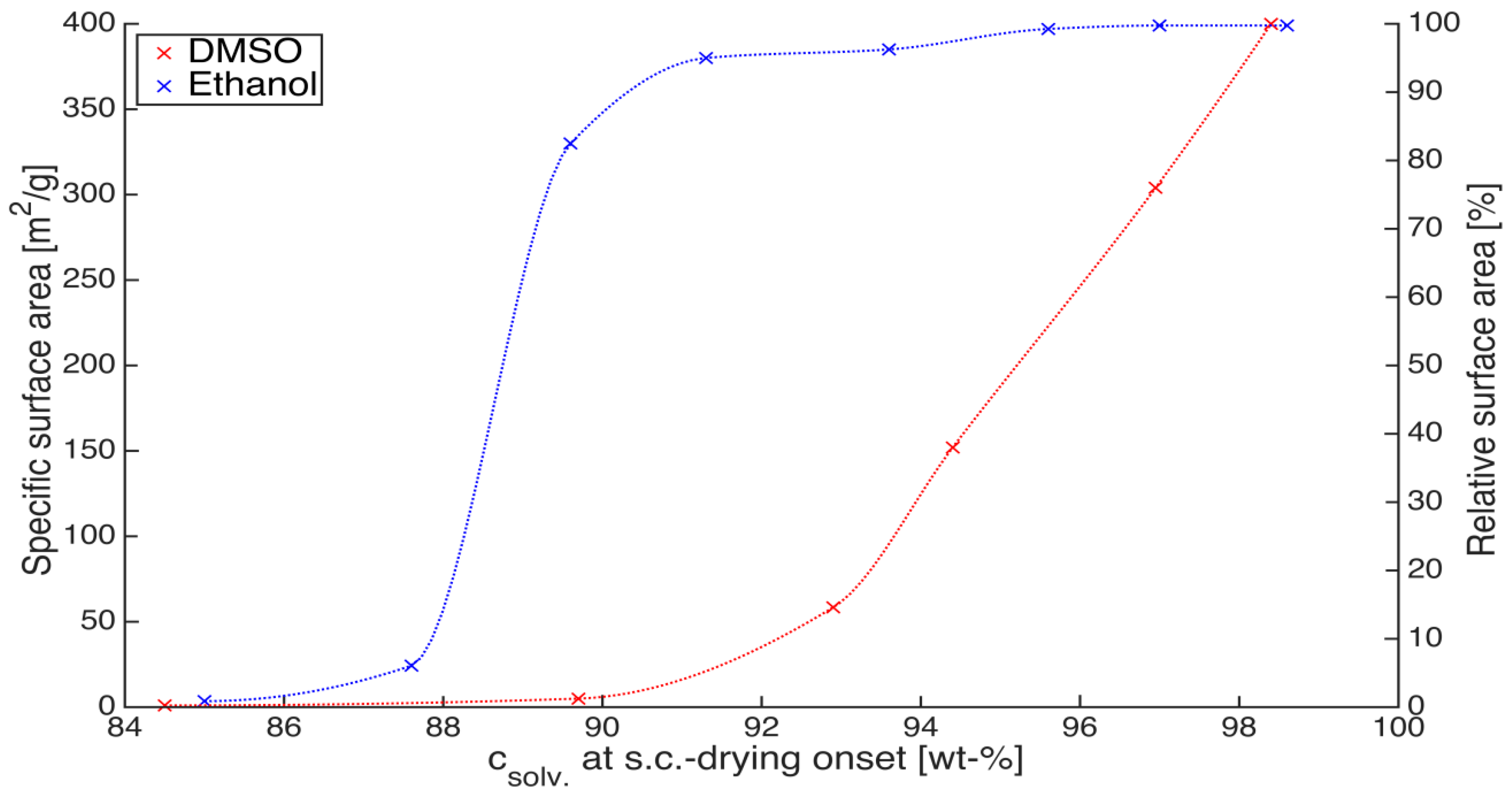 An important question that arises during solvent exchange is the extent of solvent exchange required prior to supercritical CO2 drying. This is an important aspect when considering solvent recycling in a production setup. For example, ethanol forms an azeotrope with water at 96 wt %. In case higher solvent concentrations inside the gel are required, alternative solvent recovery solutions such as azeotropic or pressure swing distillation, membrane separation or molecular sieving techniques should be considered instead of simple distillation. Surface area measurement can provide a sensitive assessment of aerogel quality to varying operating conditions. Insufficient solvent concentration inside the gel results in shrinkage and deformation but this information can be more precisely captured by measuring the drop in surface area due to pore collapse than the quantification of gel shrinkage. A plot of surface area against solvent concentration at which supercritical drying commenced is indicated in Figure 7 for two solvents, ethanol and DMSO. The experiments were performed on 1 wt % calcium alginate with higher crosslinking degree (Q2).