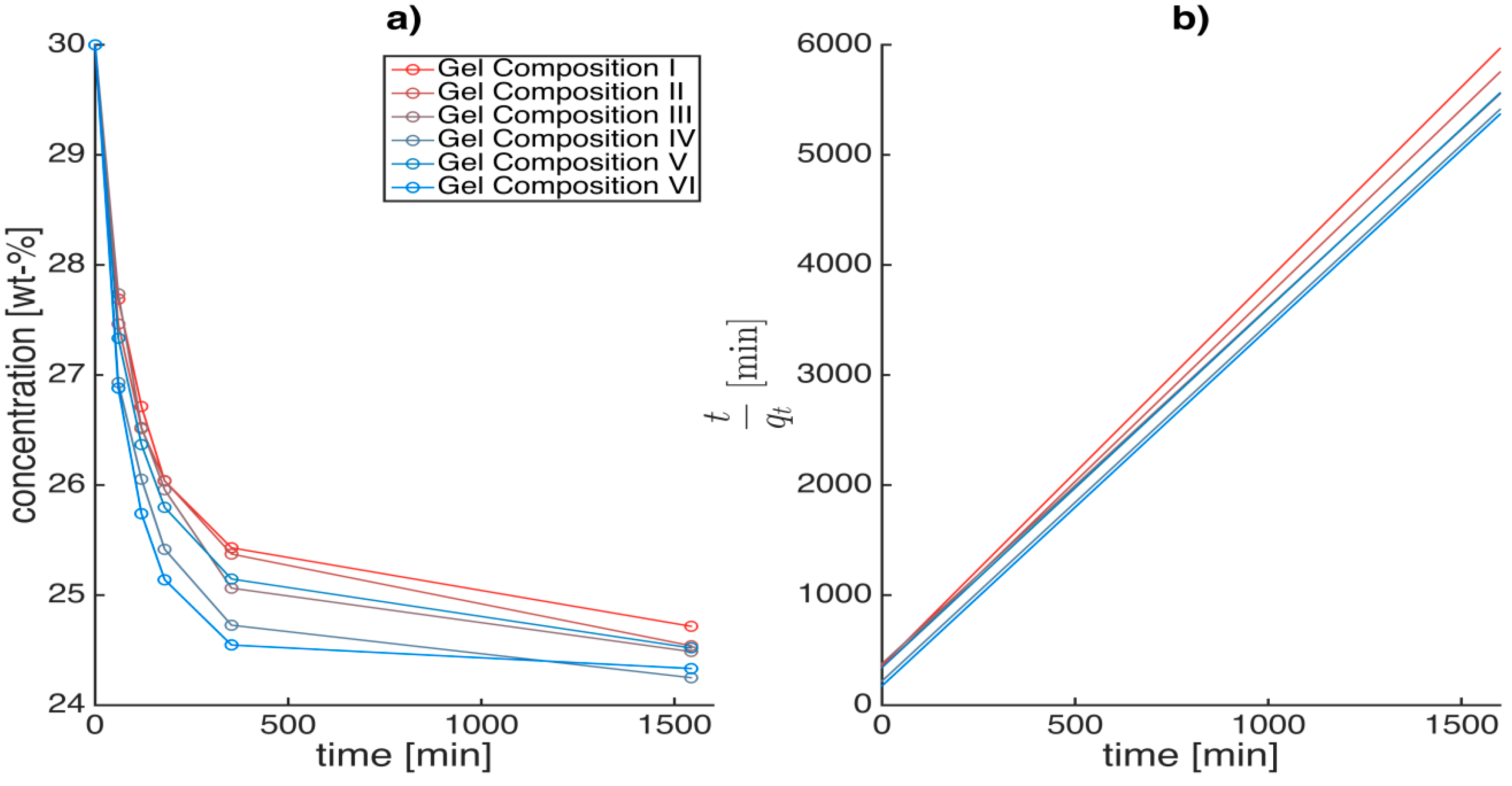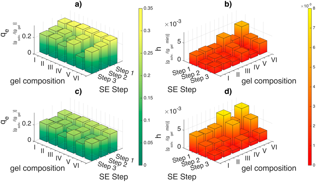 There are three parameters that can be derived from the pseudo second order equation: first, the equilibrium uptake qe (gsolv/ggel), which is dependent on both the concentration gradient and the solvent amount and provides information regarding the maximum solvent the hydrogel can take in after infinite exposure time. In our case, we assume that the equilibrium is attained after 24 h. Second, the kinetic coefficient k2 (ggel/gsolv·min−1) which is indicative of how fast the equilibrium uptake qe is reached. The sorption capacity and thereby the kinetic parameters are dependent on the initial adsorbate concentration, temperature, pH, adsorbent size and nature of the solute [42]. Thereby, to compare across solvents, the concentration gradient (ΔC) and the solvent amount () (initial adsorbate amount) were fixed prior to experiment and analysis. The last parameter, the initial sorption rate h (gsolv/ggel·min−1) is derived from the y-intercept reciprocal () and is a better parameter for comparison as k2 is strong function of qe. When the concentration gradient and solvent amount is fixed, the initial sorption rate (h) should indicate the solvent affinity to the gel matrix.