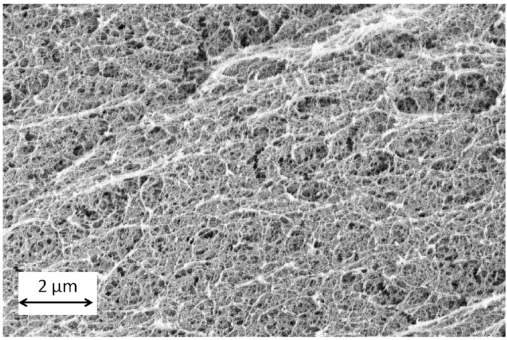 The first conclusion that could be drawn is that the solvent exchange process is also dependent on the alginate composition and crosslinking degree. The equilibrium uptake qe (Figure 9a) for step 1 of the solvent exchange is constant across alginate composition. However, based on the initial sorption rates (h) for step 1 (Figure 9b), the solvent exchange is fastest for highly crosslinked soft gels (gel VI). When comparing across the highly crosslinked gels (II, IV and VI), it is observed that the initial sorption rates decreases with increasing alginate concentration. Calcium alginate hydrogel consists of a fibrillar matrix (Figure 10) with water trapped in its pores. With increasing biopolymer concentration, the tortuosity increases and also there might be additional resistances in the form of surface adsorption, hydrogen bonding or water dissolution in the matrix resulting in decrease in the sorption rates.
