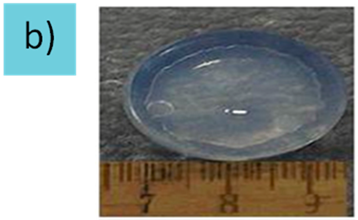 In order to obtain homogeneous gels, gelation was performed using the CO2 induced gelation method. Carbon dioxide’s property to act as a weak acid under certain conditions (p = 3–5 MPa, T = 295 K) was used to lower the pH value (pH = 3) and thus initiate the release of calcium ions from CaCO3 resulting in the gelation [2,3]. The prepared dispersions were placed in the setup depicted in Figure 11a. After sealing the autoclave, it was pressurized with carbon dioxide and the operating pressure of 5 MPa at ambient temperature (T = 293 K) was kept constant for 24 h. Then the pressure was released steadily over one hour (approximately 0.08 MPa·min−1). After depressurization, the samples were removed from the autoclave and weighed. In order to further analyze the swelling behavior after gelation, the gels (Figure 11b) were placed in cups containing sufficient amounts of deionized water, so that the gels were completely covered with water for approximately 24 h and weighed afterwards.