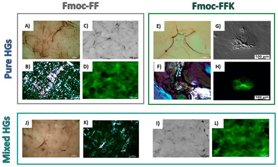 Birefringence CR assay and ThT assays for xerogels prepared by pure Fmoc-FF and Fmoc-FFK HGs (1.0 wt%) and mixed Fmoc-FFK/Fmoc-FF HGs (1.0 wt%, 1/5 w/w). Polarized optical microscopy images of air-dried samples stained with Congo red solution under bright-field microscopy (A,E,J) and between crossed polarizers (B,F,K). Confocal images of xerogels, stained with 50 μmol/L ThT solution, under bright-field microscopy (C,G,I) and in the green spectral region (GFP). λexc = 450 nm; 460 nm < λem < 600 nm (D,H,L).