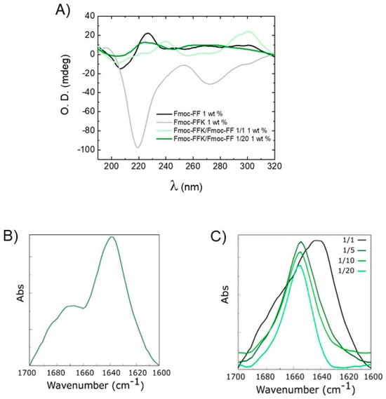 Secondary structure characterization of mixed hydrogels via CD and FTIR. (A) CD spectra in optical density of hydrogels at 1.0 wt%: Fmoc-FF (black line), Fmoc-FFK (grey line), Fmoc-FFK/Fmoc-FF (1/1) (light green line), and Fmoc-FFK/Fmoc-FF (1/20) (dark green line). FTIR spectra of pure Fmoc-FFK HGs (B) and mixed Fmoc-FFK/Fmoc-FF (C) at 1.0 wt% at all the weight/weight ratios.
