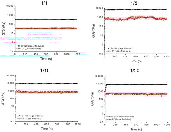 Time sweep (20 min) for mixed hydrogels Fmoc-FFK/Fmoc-FF at three different weight/weight ratios (1/1, 1/5, 1/10, and 1/20). The rheological analysis is reported in terms of G′ (storage modulus) and G″ (loss modulus).