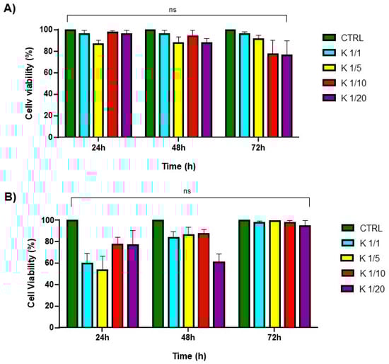 Cell viability assay. MTS assay of HaCaT (A) and 3T3-L1 (B) cell lines treated for 24, 48, and 72 h with hydrogel’sconditioned medium. ns: not significant versus control cells.