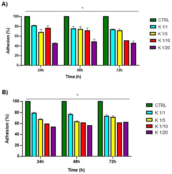 Adhesion test of HaCaT (A) and 3T3-L1 (B) cell lines for 24, 48, and 72 h on indicated mixed hydrogels. * p < 0.05, versus control cells.
