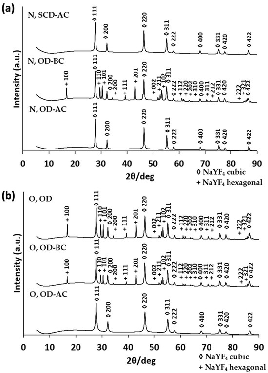 XRD diffractograms of (a) lanthanide nitrates-based UCNPs and (b) lanthanide oxides-based UCNPs. For notation of the formulations, please refer to Table 1.