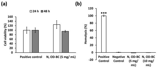 (a) Cell viability of BALB/c3T3 cells in contact with N, OD-BC UCNPs at 5 mg/mL determined by WST-1 test. Positive control: BALB/c3T3 cells. No statistically significant differences among groups were detected (post hoc Tukey HSD multiple comparison-test; p < 0.05). (b) Hemolytic activity (expressed in %) for N, OD-BC UCNPs (5 and 10 mg/mL). Positive and negative controls were 4% (v/v) Triton X-100 solution and PBS pH 7.4 solution, respectively. Statistically significant differences among groups were represented as *** (post hoc Tukey HSD multiple comparison test; p < 0.001). For notation of the formulation, please refer to Table 1.