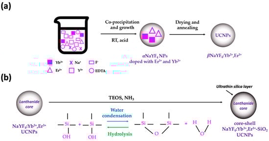 Synthesis of the lanthanide core-shell UCNPs was thus performed according to the scheme depicted in Figure 7a,b.