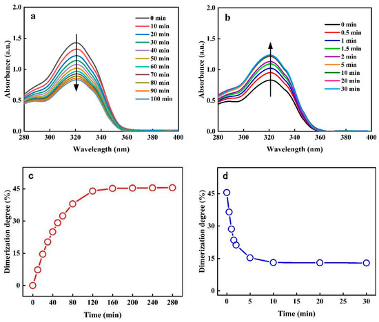 The photoresponse performance of PAC was first studied using a UV absorption spectrum. The time-dependent absorption spectra of PAC solutions were conducted under 365 nm UV light. As shown in Figure 2a, the characteristic absorption peak of the coumarin group still appears at 320 nm, as reported in the literature. The intensity of 320 nm gradually decreases with the length of ultraviolet irradiation due to photodimerization between the coumarin. This downward trend slowly stops after 100 min of irradiation. This demonstrates that the photodimerization between the coumarin tended towards reversible chemical equilibrium. Then, the PAC solution continued to be irradiated with 254 nm for 30 min, and the absorption intensity of peak at 320 nm was quickly restored (Figure 2b). This is attributed to the reversible photoresponse behavior of the coumarin. When the polymer PAC is irradiated with 365 nm ultraviolet light, a photocyclization addition reaction occurs between two adjacent coumarin double bonds on the polymer PAC. Since a photocleavage reaction occurs under irradiation with 254 nm ultraviolet, the cyclobutane structural bond formed by the photochemical addition reaction will break and restore the structural bond of coumarin. Moreover, this reversible photoresponse behavior of PAC exhibits a characteristic of slow photodimerization and fast photocleavage. The absorbance spectrum of PAC shows extremely different response speeds of photodimerization and photocleavage, respectively. To further investigate the pattern of photodimerization over time, the degree of photodimerization was calculated using Equation (1).