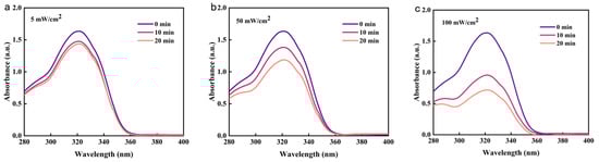 To investigate the stability of photoresponsiveness, the cycle of photodimerization was studied by switching the wavelength of light sources repeatedly (Figure S8). Note that the absorbance at 320 nm could not recover to the initial value and was gradually reduced after each cycle. It was speculated that a few dimers form irreversible cross-linking points. Furthermore, the intensity of ultraviolet light has a certain impact on the photodimerization efficiency and photocleavage efficiency (Figure 3). Improving the intensity can accelerate the photodimerization or photocleavage; the higher the light intensity, the significantly faster the dimerization rate. An intensity of 100 mW/cm2 is considered the most suitable, which can not only meet the high light dimerization efficiency but also avoid damage to the material caused by a long period of excessive light intensity.