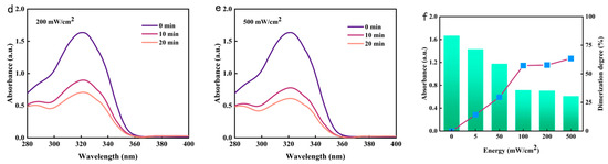 Photoresponsiveness of PAC (concentration: 0.0001 g/mL) irradiated with 365 nm UV light with an intensity of 5 mW/cm2 (a), 50 mW/cm2 (b), 100 mW/cm2 (c), 200 mW/cm2 (d), and 500 mW/cm2 (e), respectively. (f) Relationship between light intensity and degree of photodimerization. (The column indicates the UV absorbance, while the dotted line represents the degree of polymerization).