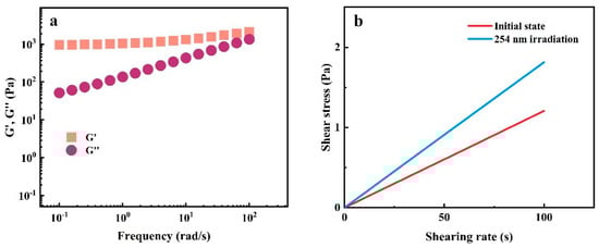 To verify the state of sol and gel, the rheological test was carried out on 18 wt% PAC gel to obtain the storage modulus G′ and loss modulus G″. The storage modulus G′ is greater than the loss modulus G″, which exhibits rheological behavior typical of hydrogel (Figure 5a). Then, the PAC gel was irradiated with 254 nm UV light and its flow curve tested. Due to the small amount of polymer dispersion in the solution, the slope of its flow curve remains constant, indicating that the PAC solution at this time is a Newtonian fluid (Figure 5b). However, compared with the flow in the initial state, the slope of the flow curve is higher at this time. This is caused by the incomplete photocleavage reaction, which increases the viscosity of the sample. However, it can still be confirmed that PAC solution undergoes a reversible sol–gel transition process under light stimulation. Although PAC gel cannot be formed below the concentration of 18 wt%, the viscosity of PAC solution still rapidly rises due to a small amount of cross-linked network (Figure S10). From the above study, the minimum concentration of PAC that forms a hydrogel is 18 wt%.