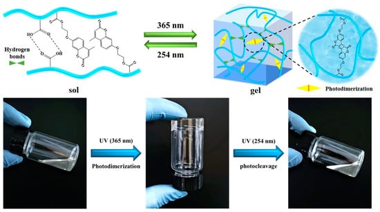 Photoresponse has great prospects among the many stimulus-response methods due to its non-physical contact, instantaneous trigger, convenient control, and simple operation [36,37,38,39]. The coumarin is known to undergo a reversible dimerization that leads to stable cyclo-butane-based dimers by irradiating (λ > 300 nm), whereas the reverse photocleavage reaction occurs under a wavelength less than 260 nm [40,41]. A series of coumarin derivatives have been designed and synthesized specifically for biofluorescent labeling [42]. Recently, light-responsive coumarin bearing amphiphilic copolymers was combined with temperature responsive micelles to obtain both mechanically strong and injectable gels by Mahinur et al. [43]. Furthermore, it is important to note that polyacrylic acid is a biocompatible material, which is an ideal polymer for constructing a biocompatible gel [44]. Herein, we develop a facile, photoresponsive, self-healing hydrogel based on copolymer poly(acrylic acid-co-7-2(acryloyl hydroxypropyl)-4-methylcoumarin) (PAC) which is a graft copolymerization of 7-2(acryloyl hydroxypropyl)-4-methylcoumarin onto acrylic acid. The copolymer PAC inherits the photoresponsiveness of coumarin and exhibits a reversible sol–gel transition via photostimulation (Figure 1). The network of PAC gel was further constructed via reversible photodimerization, physical entanglement, and hydrogen bonding, and possesses excellent mechanical properties. The self-healing properties of the hydrogel on microcracks were investigated, demonstrating its rapid self-healing properties. Moreover, based on the reversible sol–gel transition, the adhesion property of the copolymer PAC was studied as a recyclable adhesive.