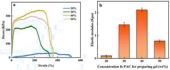 Stress–strain curves (a) and elastic modulus (b) of gels newly prepared with different PAC concentrations.