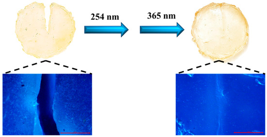 Notably, the sol–gel transition was reversible as a result of the reversible photoresponsiveness of PAC. Once irradiating the PAC gel with 254 nm ultraviolet light, the gel network will undergo cleavage of covalent cross-linking points (Figure 6). The remaining physical cross-linking points are insufficient to form a gel network, so that the gel change to sol. Then, the covalent cross-linking is formed again by irradiating sol with 365 nm ultraviolet light, and the sol will return to gel. Finally, reversible sol–gel transition was realized via photostimulation.