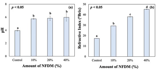 The initial pH values were 5.77 for 10% (w/v), 5.84 for 20% (w/v) NFDM, and 5.98 for 40% (w/v) NFDM as compared to the control sample which was at 3.95. Even though the initial pH is not significantly different among the NFDM-containing samples, as given in Figure 1a, it becomes harder to accommodate the pH drop with the same amount of starter culture within the duration of fermentation. This might be because of the increased viscosity of the samples (results were not shown) when more NFDM was incorporated, which affected the microbial growth and their diffusion within the sample. The NFDM addition at 20–40% yielded very thick slurries (visual observation), which were significantly different from the consistency of the control sample (results are not shown). Therefore, based on the pH, RI values and appearance of the sample in terms of foaming and bubble formation, 10% (w/v) was selected for the formulation of the beverage. Moreover, NFDM or protein enriched beverages in the literature, is generally at 10% (w/w or w/v), which is in line with the present study [17,24].