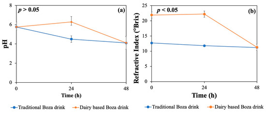 During fermentation, both traditional boza and dairy-based boza beverages exhibited a decrease in pH, with the traditional beverage sample showing a rapid drop compared to dairy-based sample. After 24 h, the pH values were 4.49 and 6.28 for traditional and dairy-based boza. There was no significant change in pH for the dairy-based sample after 24 h. After 48 h, the dairy-based sample went through a similar pH drop wherein both the samples had a pH value of 4.09, as shown in Figure 2a, indicating a slow fermentation in the dairy-based sample. The RI values decreased in both traditional boza and dairy-based boza during fermentation Figure 2b. The initial RI for traditional and dairy-based samples were noted as 12.7 and 21.9° Brix, respectively. After 24 h fermentation, a drop in RI was observed in the traditional boza sample, but that of the dairy-based sample remained similar to its initial value. As depicted in Figure 2b, after 48 h fermentation, a drastic change was observed in the dairy-based sample, wherein it reached 11.8° Brix, which was similar to the traditional sample. The RI values obtained in the experiment were indicative of the composition and soluble dry matter content of the sample. During fermentation, microorganisms use sugars and convert them to ethyl alcohol and carbon dioxide. Hence, the RI could be used to represent the progress of the fermentation process. A similar method was used for analyzing the fermentation process in a rice-based fermented product called Tape Ketan in a study conducted by [29]. RI was used for alcohol measurement, and the study concluded that as the fermentation progressed, there was an increase in alcohol content and a decrease in dissolved sugar, justifying the reduction in RI.