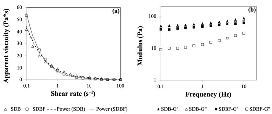 As shown in Figure 3a, the apparent viscosity of fermented (SDB-F) boza and unfermented dairy-based slurry (SDB) showed shear-thinning behavior evident by the reduction in the apparent viscosity values over the increased shear rate. The related model parameters were tabulated in Table 1. The correlation coefficients for the model fitting were greater than 0.92, which ensures a successful data fitting. Both samples exhibited similar behavior in the given range of shear rates (p ≤ 0.05). Fermentation did not affect the flow behavior of the sample significantly (p ≤ 0.05). Also, n values were less than 1, which proved the shear-thinning behavior of the samples (Table 1). Hence, both consistency and the flow behavior index were not affected by fermentation, which might be related to low alcohol content and CO2 levels reached during fermentation.