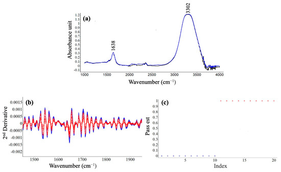 FTIR absorbance spectra of SDB-F (blue) and SDB (black) representing the average of ten sample measurements (a), the second derivative of all spectra: red represents SDB, and blue represents SDB-F (b), and SIMCA result: blue (10 replicates of SDB-F sample spectra) and blue (10 replicates of SDB sample spectra) (c).