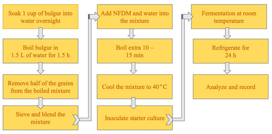 Sugar and nonfat dry milk (instant dry milk, Great Value) were purchased from the local market (Columbia, MO, USA). Bulgur (Duru, fine bulgur, 11 g protein/100 g) and a commercial boza were supplied from Turkey (Omur Boza).