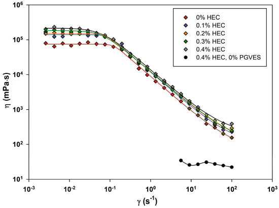 Viscosity versus shear rate for PGVES-based formulations with various hydroxyethyl cellulose (HEC) concentrations at 20 °C.