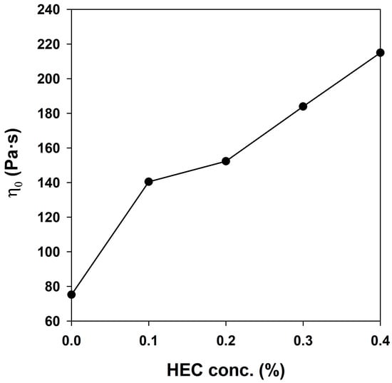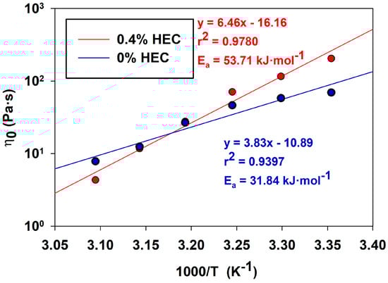 Figure 7 shows semi-logarithmic dependences of the zero-shear viscosity of compositions based on PGVES and PGVES with HEC (0.4%) on the reverse temperature. The temperature ranged from 20 to 50 °C. The zero-shear viscosity curve versus temperature is described by the Arrhenius dependence [,,]: