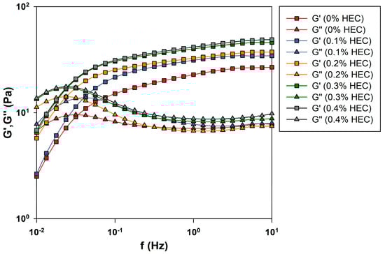 The dependences of the curves of dynamic moduli on the oscillation frequency for gels based on PGVES with HEC are presented in Figure 3. Similar to the values of , the addition of HEC contributes to an increase in the values of dynamic moduli, especially affecting the storage modulus . At low frequencies (), gels are characterized by the behavior of a viscous liquid; in this range, the values of the loss modulus are greater than the values of the storage modulus. At higher frequencies (), the storage modulus values become noticeably higher. In this frequency range, the behavior of the gel resembles the behavior of an elastic body. The intersection point of the curves of the dynamic moduli  with increasing polymer concentration moves to lower frequencies, which indicates an increase in the relaxation time . As the relaxation time reflects dynamic processes in the system (the time of rupture and assembly of one micelle), its increase occurs due to compaction of the micellar network with increasing polymer concentration [,]. Accordingly, at a HEC concentration of 0.4%, a system with the highest viscoelastic properties is formed.