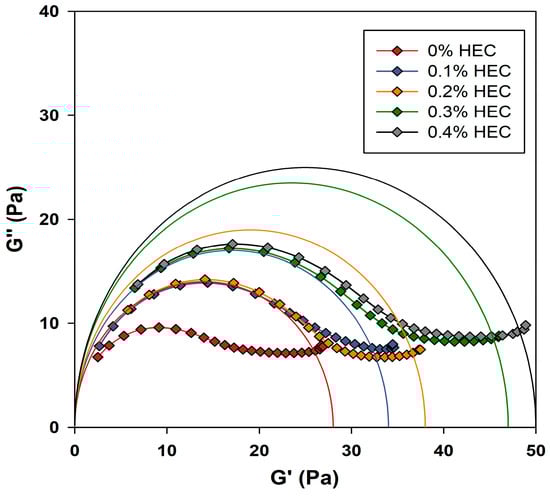 For a more complete study of the mechanism of the HEC influence on the rheological properties of PGVES, one can consider Cole–Cole plots [,,,], which allow one to evaluate the deviation of the system from the Maxwell model (Figure 4). For each of the compositions, curves were constructed based on theoretical values calculated using the Maxwell model; in the figure they are presented in the form of semicircles and correspond to the following equation: