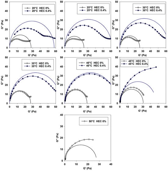 Micellar systems are formed through intermolecular interactions of various natures. Accordingly, the viscoelastic behavior of such compositions strongly depends on external conditions, especially temperature. Figure 5 shows Cole–Cole plots based on oscillatory data obtained with a gradual increase in temperature. The temperature range was selected from 20 to 50 °C in increments of 5 °C. The studies were carried out for gels based on PGVES and PGVES with the addition of HEC at the maximum concentration (0.4%).