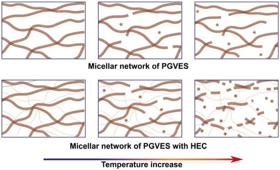 Scheme of degradation of the PGVES micellar network and PGVES with polymer with increasing temperature.
