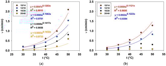 With increasing temperature, the settling velocity of particles increases, which correlates with the rheological parameters obtained earlier. Experimental points can be described by an exponential curve. However, in the case of a PGVES system with a polymer, the exponential curve can only be used in the case of large proppant fractions: 10/14 and 12/18. The fractions settling velocity of particles 16/20 and 20/40 does not increase exponentially with temperature. In addition, for the gel with the polymer these values are lower than for the gel without, although the rheological parameters with temperature increase degraded more strongly in the polymer gel. It is possible that the values of , which are much larger in polymer solutions due to a denser micellar network, contribute particularly to this.