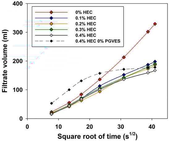 The experiment revealed a tendency towards a decrease in the rate of fluid losses with increasing polymer concentration, due to the formation of a filter cake on the surface of the filter and higher viscosity of the compositions. Note that a system containing only HEC 0.4% is characterized by a specific form of fluid loss curve with a rapid exit to a plateau due to more intense formation of filter cake [].
