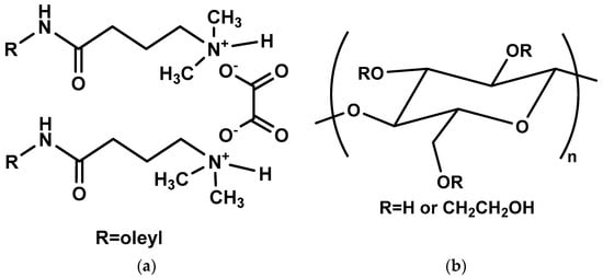 The concentration of PGVES in all experiments remained constant—6 wt%. The gel was prepared by consistently dissolving calculated amounts of oxalic acid and N-[3-(dimethylamino)propyl]octadec-9-enamide in fresh water at a molar ratio of 1 to 2. When studying gels based on PGVES with HEC, the required amount of polymer was initially dissolved in water, and, after its complete dissolution, reagents were introduced to obtain PGVES. Structural formulas and schematic representations of PGVES and HEC, as well as the resulting micelles, are shown in Figure 10 and Figure 11.