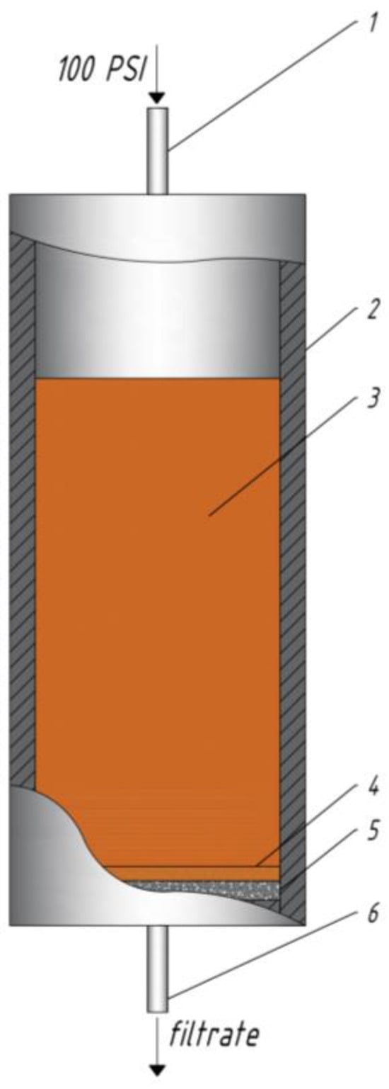 Diagram of a fluid-loss cell: 1—pressurizing valve; 2—fluid-loss cell; 3—test liquid; 4—filter cake; 5—core material or layer of filter paper; 6—filtrate valve.