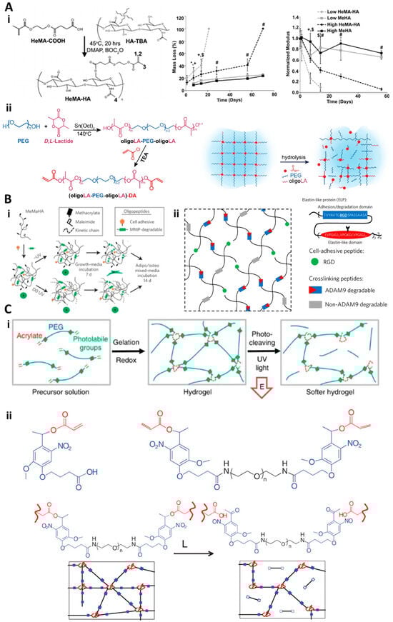(A) (i) Creation of HeMA-HA hydrolytically degradable hydrogels [37]. #, +, $, *: significant difference, p < 0.05. (ii) Formation and hydrolytic breakdown diagram of PEG-oriented hydrolytically degradable hydrogels [38]. (B) (i) Development and cell-induced enzymatic breakdown of HA hydrogels [39]. (ii) Composition of PEG hydrogels with MMP-sensitive ELP-RGD peptide links. (C) (i) Illustration of light-induced degradation in PEG-based dynamic hydrogels responsive to light [23]. (ii) Chemical make-up and light-triggered mechanism in crosslinkers based on photo-degradable nitrobenzyl [39,40].