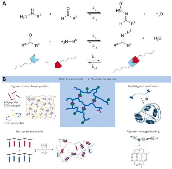(A) Utilizing reversible covalent bonds to create degradation-independent dynamic hydrogels [67]. (B) Employing supramolecular recognition patterns in the design of degradation-independent dynamic hydrogels [68].