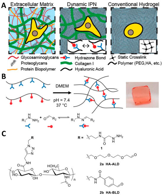 (A) Depiction of the architectures of the natural ECM dynamic HA-collagen. (B) Development of a dynamic hydrogel through reversible covalent hydrazone chemistry. (C) Molecular compositions of the modified HA [70].