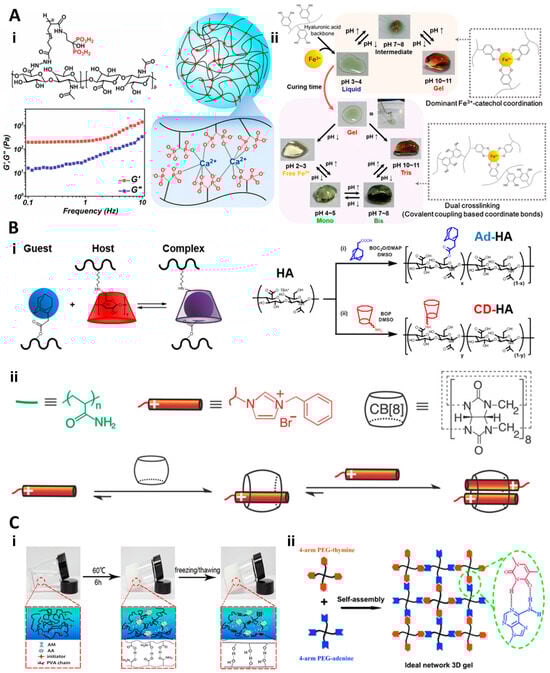 Hydrogels formulated through metal–ligand coordination for degradation-independent dynamics. (A) (i) A visual representation of a hydrogel structure created by HA-BP macromolecules, binding with Ca2+ ions [72]. (ii) A step-by-step depiction of HA-CA gel development across the pH spectrum, highlighting color transition [73]. (B) Hydrogels derived from metal–ligand coordination, ensuring degradation resistance. (i) A portrayal of the interaction between adamantane (Ad, guest) and β-cyclodextrin (CD, host) resulting in the formation of a reversible guest–host (GH) crosslink alongside the associated synthesis [75]. (ii) Sequential construction of a 2:1 ternary host–guest complex involving CB [8] and accompanying guest molecules [57]. (C) Hydrogels anchored by hydrogen bonds for persistent dynamic features. (i) A detailed diagram showcasing the formation of a completely physically crosslinked PVA/CP DN hydrogel [76]. (ii) An illustrative guide to the biological assembly of a four-arm PEG hydrogel lattice through hydrogen bonding of Watson–Crick base pair interactions between thymine and adenine structures [77].