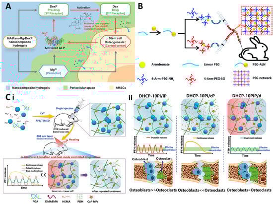 (A) The schematic positive feedback of ALP-mediated biomineralization in bisphosphonate-functionalized hydrogel. (B) The design of alendronate-loaded tetra-PEG hydrogel. (C) PTH-loaded injectable hydrogel. (i) The schematic hydrogel network and the mechanism of NIR-controlled pulsatile PTH release. (ii) The schematic PTH release-mediated manipulation of the redox balance of osteoblasts and osteoclasts.