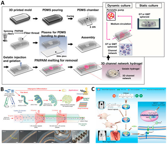 (A) The design of ovary spheroid culture in a 3D channel network hydrogel. (B) The design of microfiber hydrogel for ADSC encapsulation. (C) The design of hydrogel for PTH delivery to promote bone regeneration.