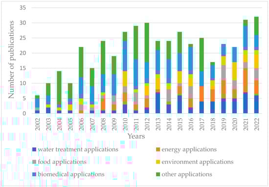 Figure 1 shows the publication trend (2000–2022) for the applications of the “gel-based membranes” field. There are multiple applications of gel-based membranes, spanning various fields like water treatment, food application, biomedical application, and energy and environment applications. Their high water content and tunable pore sizes make them especially useful for water purification, including desalination and contaminant removal [13]. Many gel-based membranes are constructed from biopolymers or are designed to be biocompatible, making them particularly suitable for biomedical applications like drug delivery, tissue engineering [14], and hemodialysis [10]. Gel-based membranes made from biopolymers are increasingly being recognized for their potential in wound healing applications. Being derived from natural sources, biopolymers are typically biocompatible, meaning they are less likely to cause adverse reactions when in contact with body tissues [15,16,17,18].