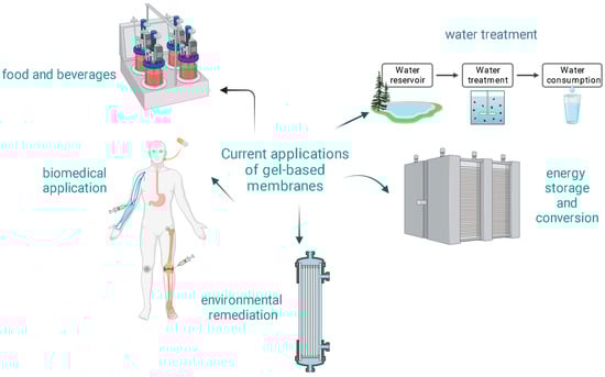 One of the defining characteristics of gel-based membranes is their unique combination of elasticity and mechanical strength. This combination allows for potential self-healing properties and resistance to physical damage [91]. The hydrophilic and smooth nature of gel-based membranes can lead to reduced biofouling and organic fouling, enhancing the membrane’s lifespan [11]. The porous structure of gel-based membranes can be finely tuned to achieve the desired permeability and selectivity [92]. Gel-based membranes, especially those derived from natural polymers, are often biocompatible, making them suitable for applications where avoiding toxic by-products is essential [93]. Figure 3 shows some current applications of gel-based membranes.