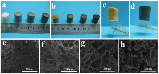 The large-scale and small-scale configurations of GO/PI aerogels. Digital pictures of GO/PI aerogels (a) prior to imidization and (b) after imidization. Digital images of GIA0 (c) and GIA2 (d) placed on a bristlegrass. Scanning electron microscope (SEM) images of GIA0 (e), GIA0.5 (f), GIA1 (g), and GIA2 (h). Reproduced with permission from [Li Zhang]. [Mechanically Robust and Flexible GO/PI Hybrid Aerogels as Highly Efficient Oil Absorbents] published by MDPI (2022) [37].
