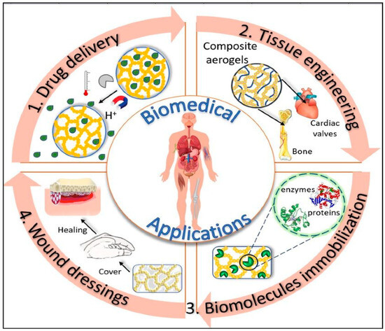 The flexible aerogel materials have prompted a growing interest in medical applications for several reasons including providing support to flexible structures [73], adaptability with generating tissues, biocompatibility, mobility and comfort for the host (patient), and being ideal for loading drugs [74] and active biomolecules [75].