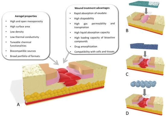 (A) Important aerogel properties for wound healing. Different aerogel configurations used: (B) aerogel films for wound-healing purposes used in low-thickness wounds; (C) scaffolds; and (D) aerogel particles as wound agents for managing healing processes for deep wounds. Reprinted with permission from [Beatriz G. Bernardes], [Bioaerogels: Promising Nanostructured Materials in Fluid Management, Healing and Regeneration of Wounds]; published by MDPI (2021) [107].