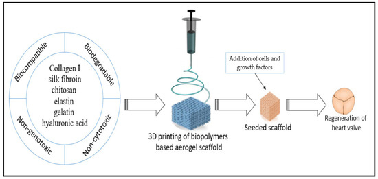 Schematic diagram representing the generation of heart valve, using a biopolymer flexible aerogel scaffold. Reprinted with permission from [Esam Bashir Yahya], [Insights into the Role of Biopolymer Aerogel Scaffolds in Tissue Engineering and Regenerative Medicine]; published by MDPI (2021) [126].